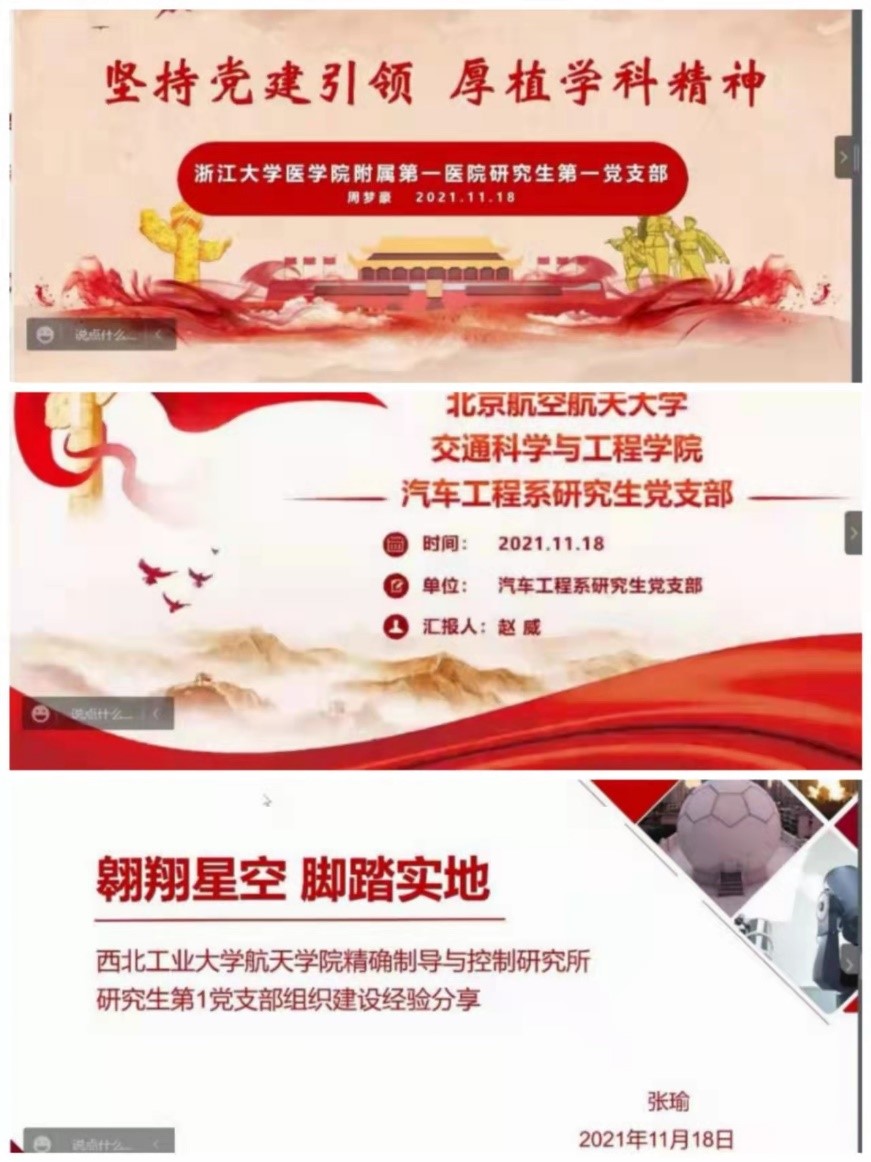精确制导与控制研究所研究生第1党支部与浙江大学医学院附属第一医院研究生第一党支部、北京航空航天大学交通科学与工程学院汽车工程系研究生党支部以线上会议模式进行了共建活动。