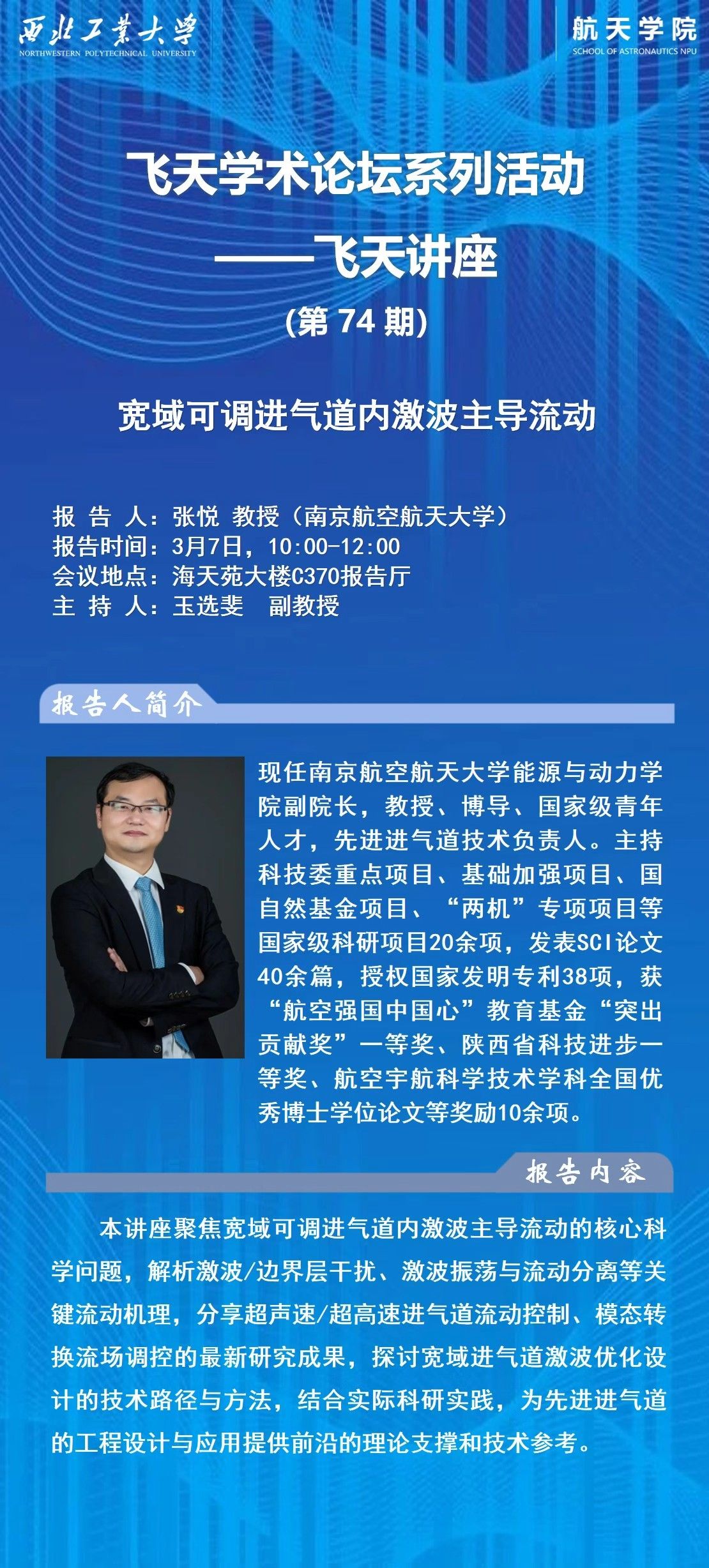 飞天学术论坛系列活动第74期:宽域可调进气道内激波主导流动