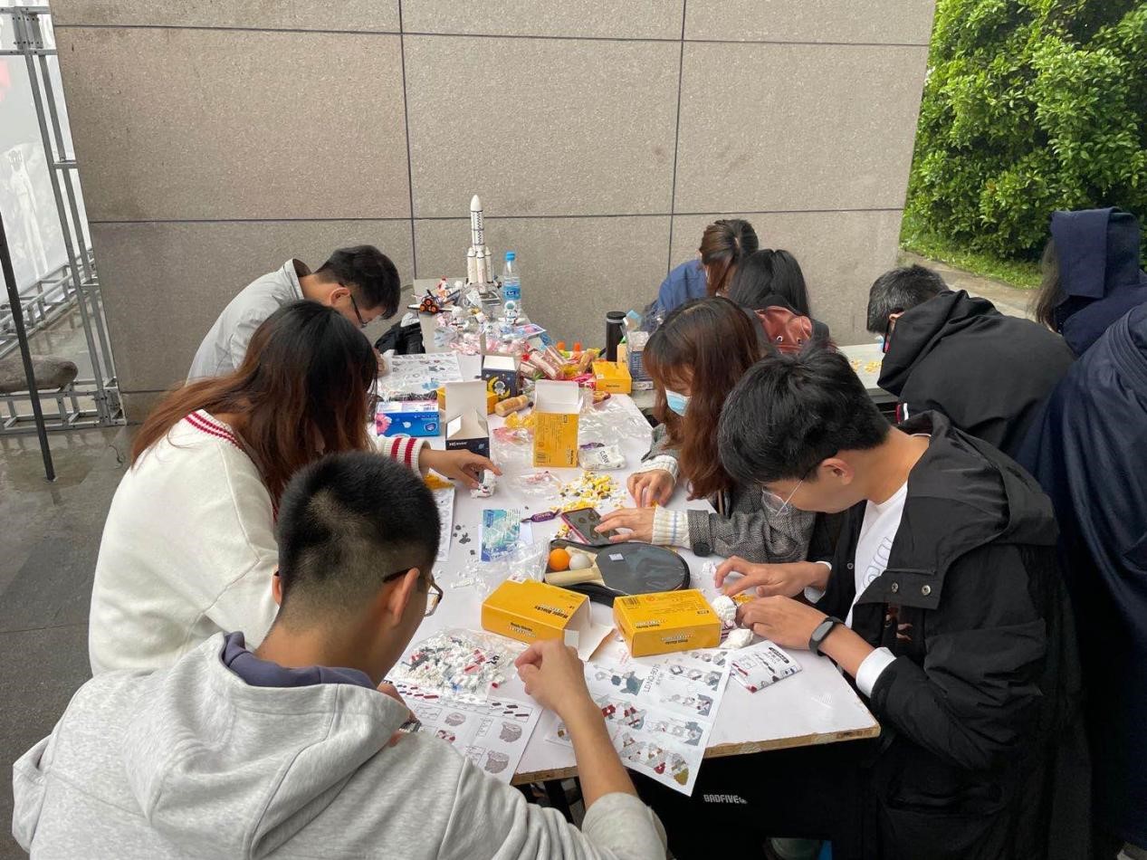 航天拼图和模型拼接是嘉年华中参与度最高的项目。一堆人簇拥在一起齐心协力,共同完成拼图模型。这不仅考验大家的图形联想能力和创造力,更考验着同学们的细心和耐力。同学们沉浸在拼图的乐趣中,细细品味不同型号飞机和火箭的差别,了解学习了相关航天知识。