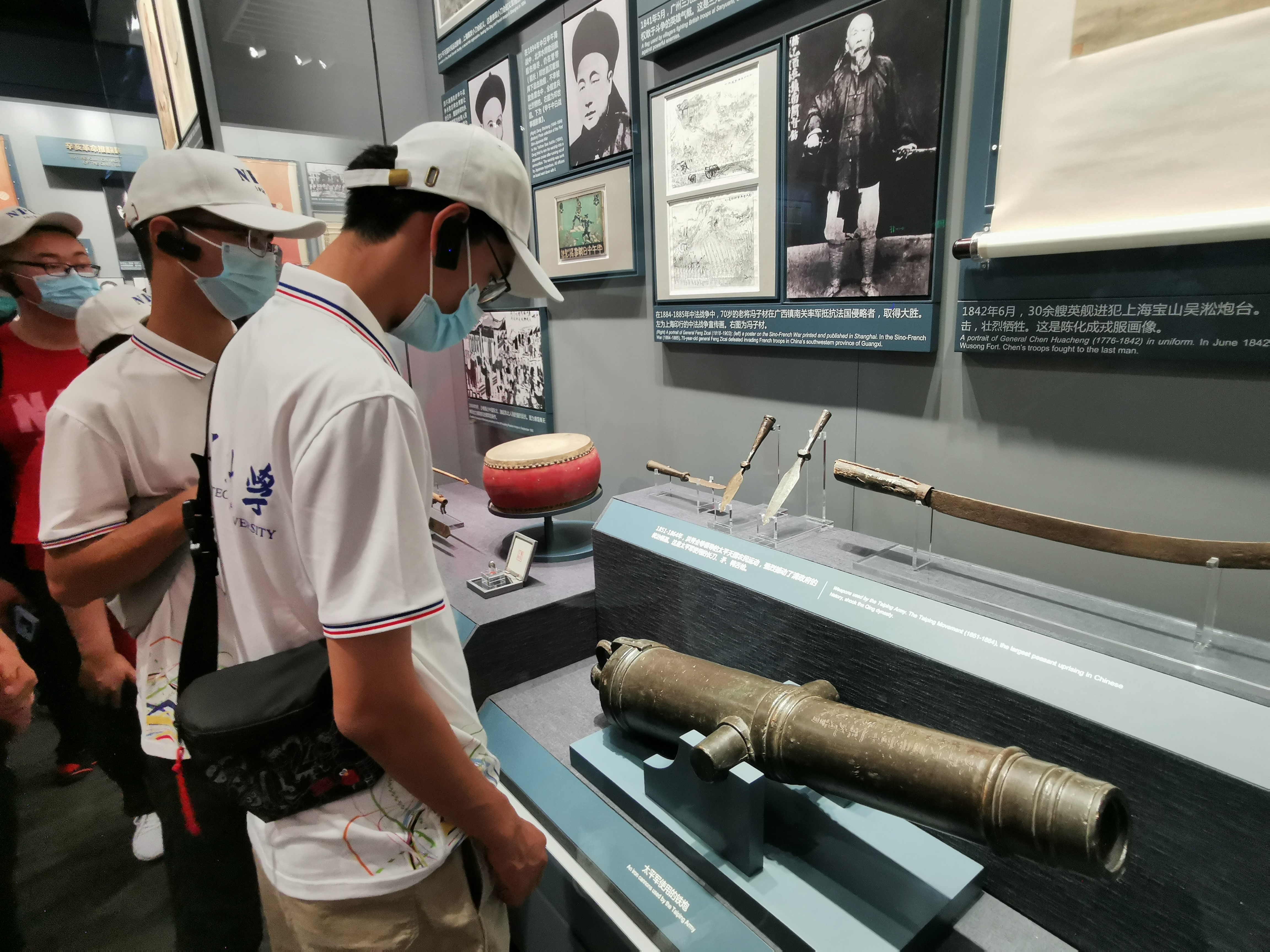 当天下午,实践队又来到了上海参观四行仓库纪念馆。1937年上海“淞沪会战”,为守卫闸北最后一块阵地,时任国民革命军第88师524团副团长的谢晋元带领“八百壮士”,依托仓库与日本军队鏖战四昼夜,将中国人民不屈的抗战精神展现给了全国同胞乃至整个世界。2020年电影《八佰》上映,将四行仓库保卫战的历史以艺术的方式呈现出来,激起无数观影者的热泪。然而当我们亲身走到晋元纪念广场,看到那面被留存下来充满战争痕迹的墙壁之时,那种震撼远比电影拍摄效果带来的还要强烈。四处密布的巨大弹孔、被轰炸损坏的断壁残垣,即使对面就是繁华的高楼大厦,历史与战争的苍凉感还是一瞬间就笼罩了过来。馆内以实物、雕塑、影像投影等手法向人们展示了战士们奋力抗战的景像。对岸是同胞、身后和头顶是敌人,一面红旗孤独而又坚强地挺立在四行仓库楼顶,这段血色深重的历史,祖国不会忘记、人民不会忘记。