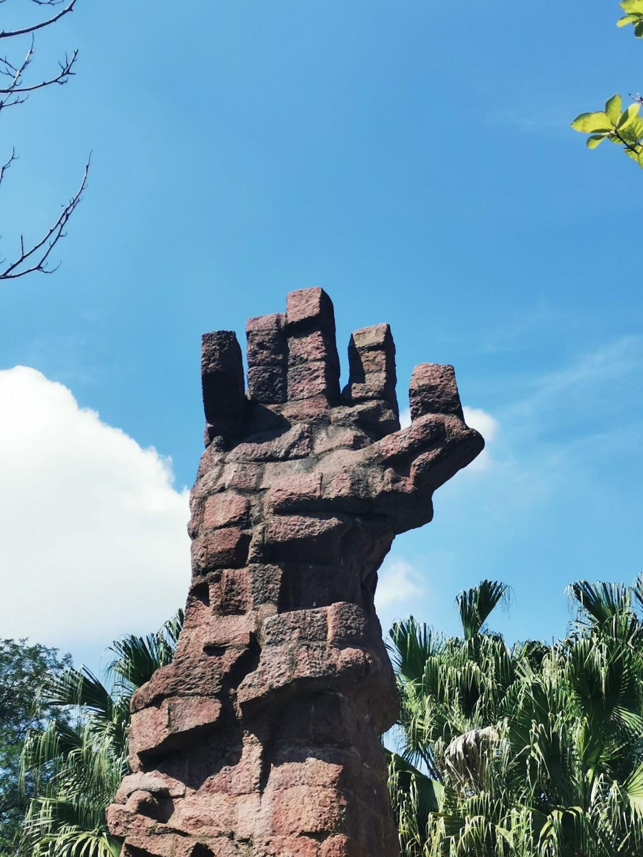 在墓园的南侧,耸立着一尊从十二桥烈士牺牲处迁移过来的大型雕塑——一只用岩石堆砌、雕塑而成的手,戴着镣铐,五指伸向天空,犹如一只呼唤自由的大手,承载着烈士们对生命的渴望、对生活的向往,也寓意着敌人可以用泥土掩埋革命先烈的身躯,却掩埋不了他们不屈向上的灵魂。