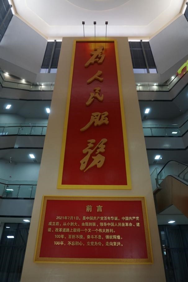 最后我们来到奋斗与辉煌——中国共产党100年礼赞展厅。走进展厅,毛主席手书的“为人民服务”五个大字的浮雕映入眼帘,气势磅礴。