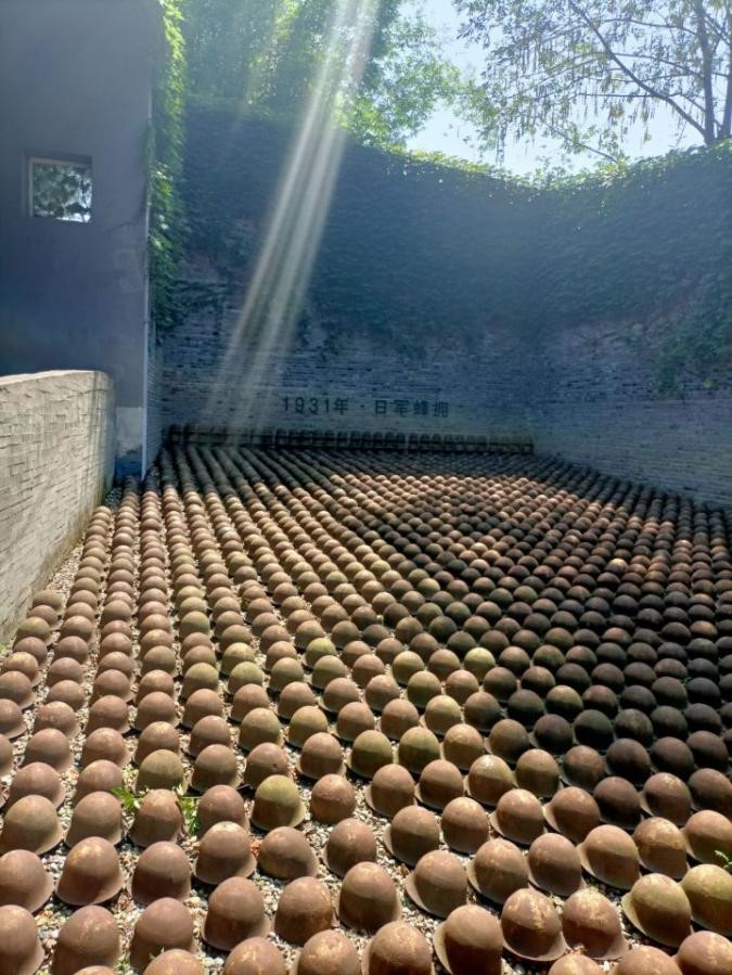 图|日本侵华罪行馆入口,1931顶日军钢盔组成的蜂拥入侵场景