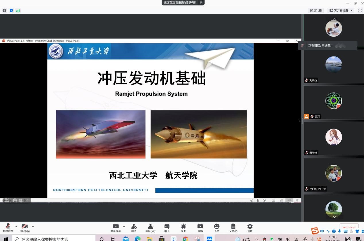 玉选斐老师介绍了由秦飞老师主讲、玉选斐和张铎老师参与的《冲压发动机基础》课程。考虑到同学们可能缺乏冲压发动机和组合动力的背景知识,玉老师先介绍了冲压发动机及组合动力发动机的基本原理和应用背景,然后详细介绍了课程的授课内容,并重点介绍了课程在实验和创新实践方面的安排。通过这门课程,让同学们不仅学到冲压发动机方面的基础理论知识,还能参与相关试验和创新实践活动。