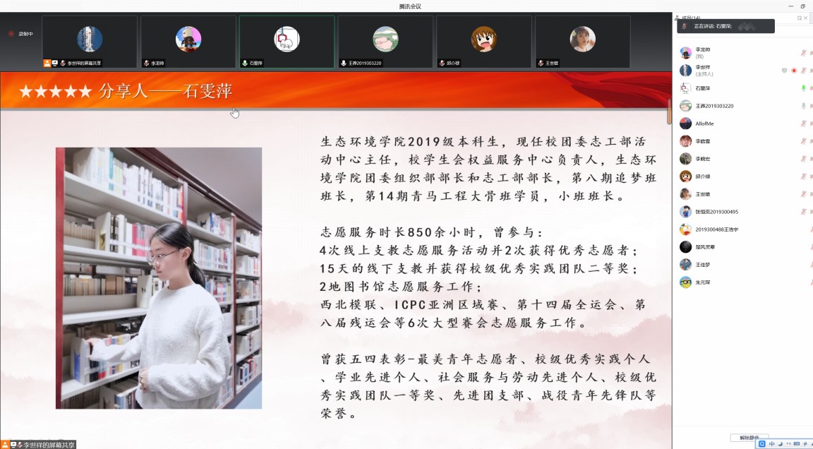 此次的西安疫情来势汹汹、传播面广。然而疫情无情人有情,在这次疫情阻击战中广大青年冲锋在前,发挥了重要作用,他们与广大医护人员一起默默地守护着我们。正如习近平总书记在全国抗击新冠肺炎疫情表彰大会上的讲话中说的“青年一代不怕苦、不畏难、不惧牺牲,用臂膀扛起如山的责任,展现出青春激昂的风采,展现出中华民族的希望!”。目前,班级已有大多数同学作为志愿者参与了学校抗疫阻击战中。为了更好地完成抗疫志愿者工作,此次团日活动邀请到了生态环境学院2019级本科生、校团委志工部活动中心主任石雯萍同学为大家分享疫情期间的志愿服务经历和经验。