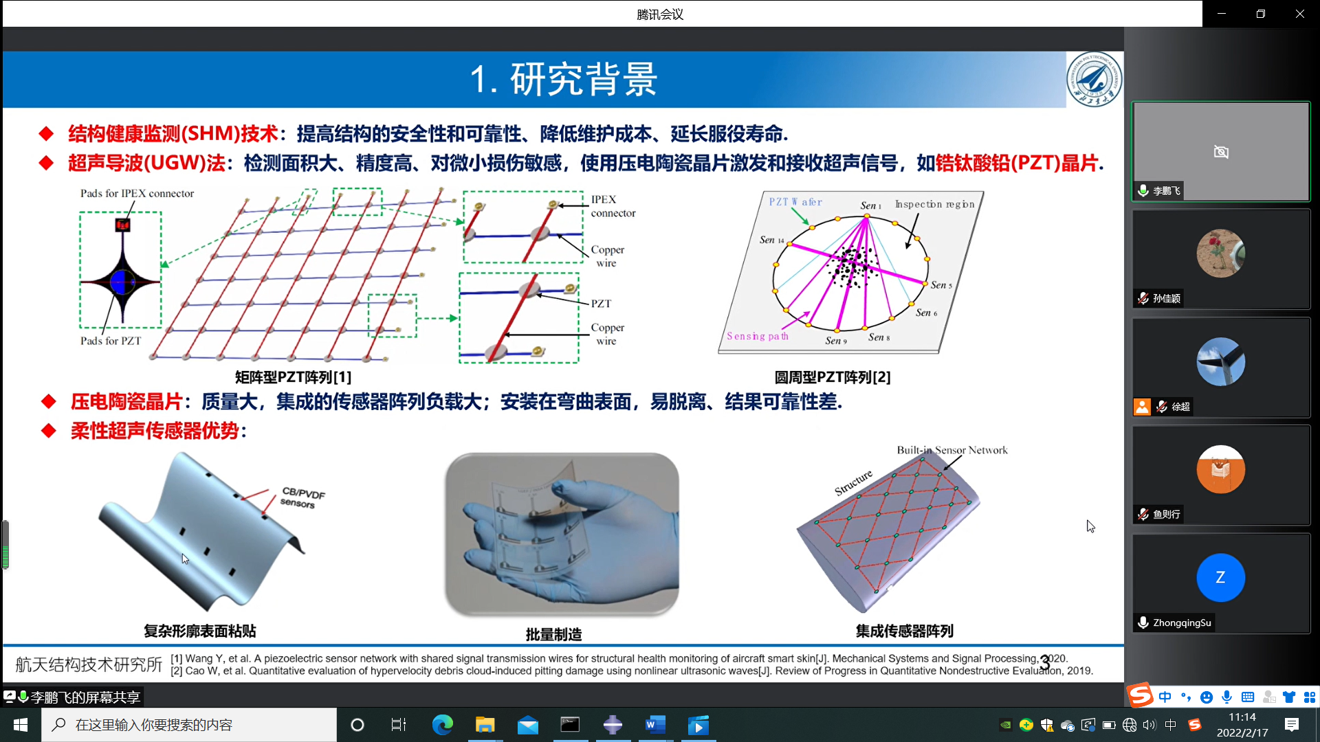随后,航天结构与健康监测团队博士生李鹏飞做了题为“柔性超声传感器综述”的学术报告,介绍了团队在柔性超声传感器方面的新进展。报告分别介绍了压电陶瓷基柔性超声传感器、压电式纳米复合材料柔性超声传感器、压阻式纳米复合材料柔性超声传感器,并对各个传感器的工作性能进行了总结分析。