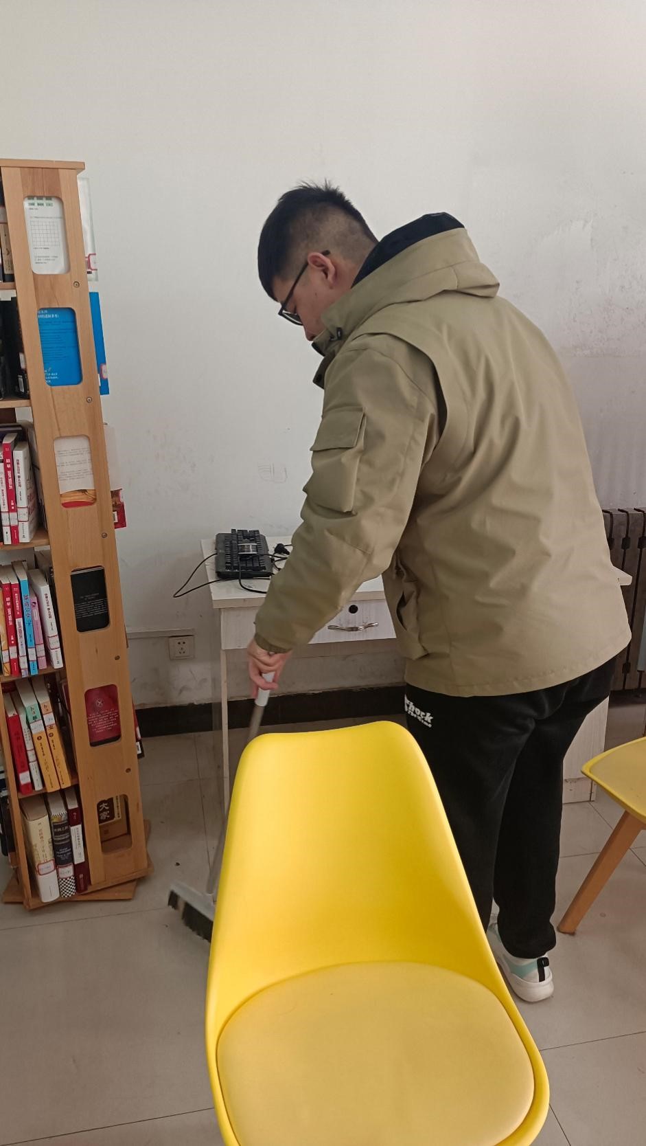 DL012116班赵一星同学在认真打扫自习室卫生