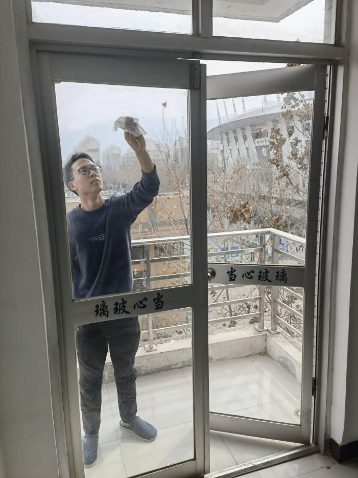 DL012114班王瑞泽同学认真擦拭门窗玻璃