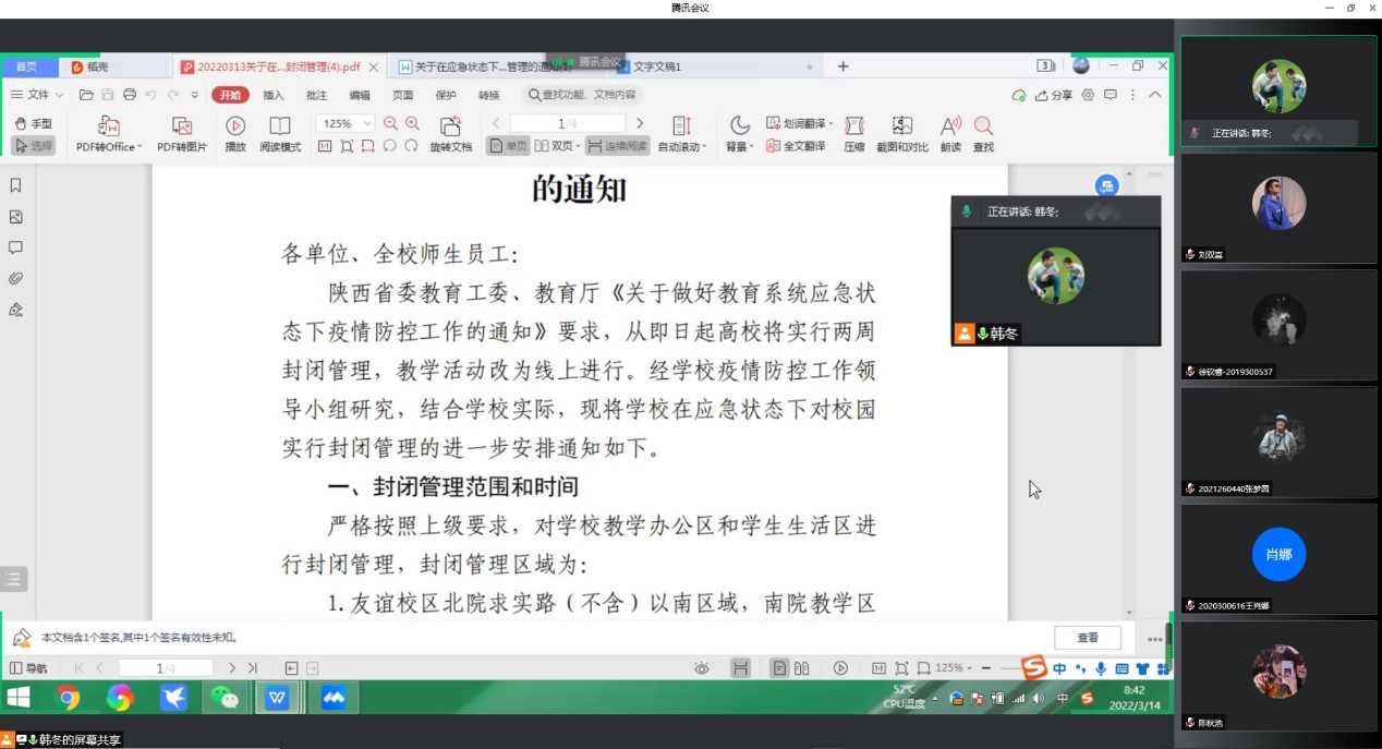 会上,韩冬带领大家学习了学校《关于在应急状态下对校园实行封闭管理的通知》与《关于在应急状态下加强学生出入封闭区管理的通知》,指出,疫情防控是现阶段工作的重中之重,应严格落实学校封闭管理相关要求,遵守疫情期间的工作纪律,坚决做到“非必要不出封闭管理区,两校区不流动”。