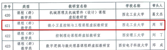 周军教授牵头,10余所高校和3个科研院所共同申报的微小卫星控制与工程课程虚拟教研室成功获批。