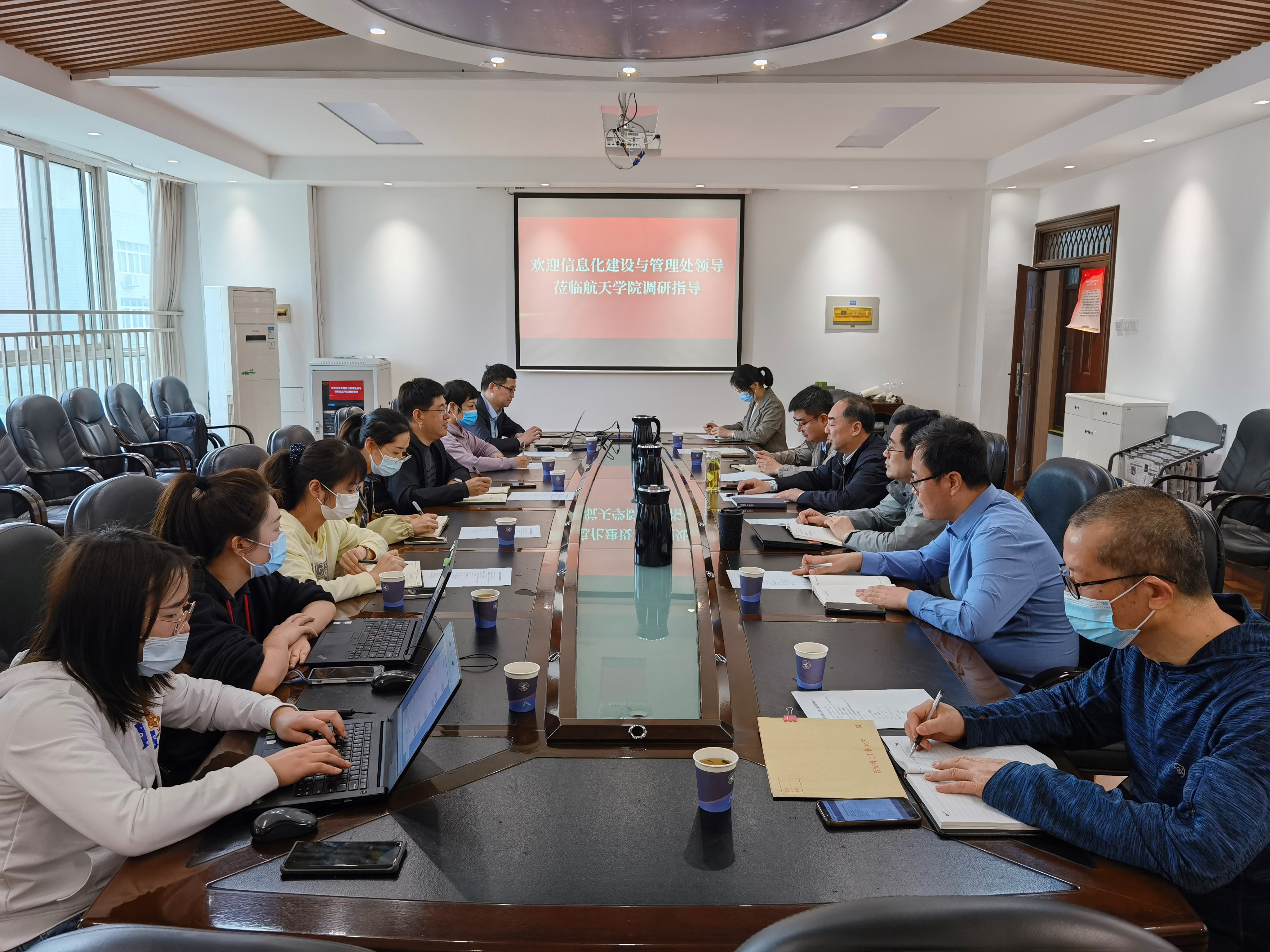 随后,双方围绕学院保密内网建设完成使用、南苑办公区域无线覆盖、长安校区海天苑大楼网络布局、视频会议系统建设、科研信息交流交互平台需求、考核平台建设等内容进行了深入交流。