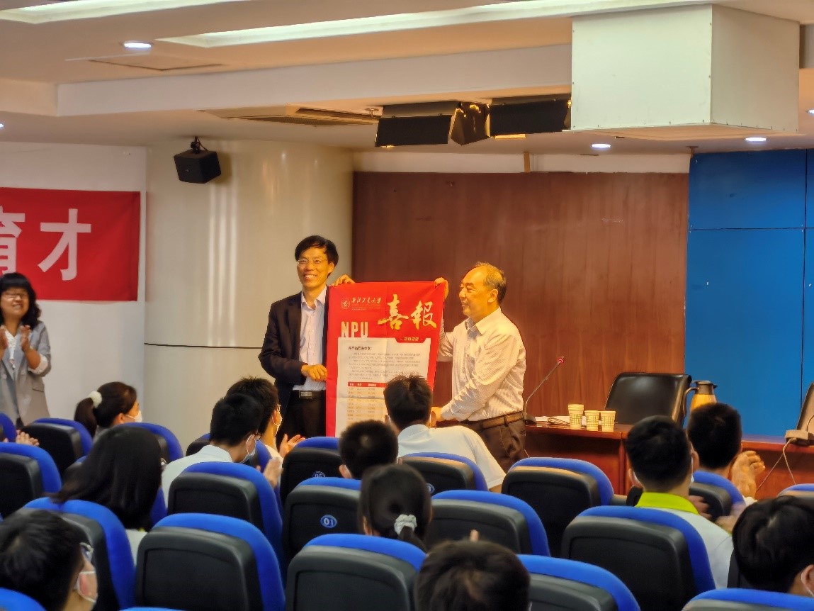 报告会开始前,岳晓奎院长向薛党鹏副校长简介了西安中学考入西工大学生在过去一年内获得的奖励和荣誉,并赠送了获奖喜报。岳院长鼓励和欢迎同学们报考西北工业大学,争取有更多优秀学子考入西北工业大学,并在大学里取得更大的成绩,获得更大的荣誉。