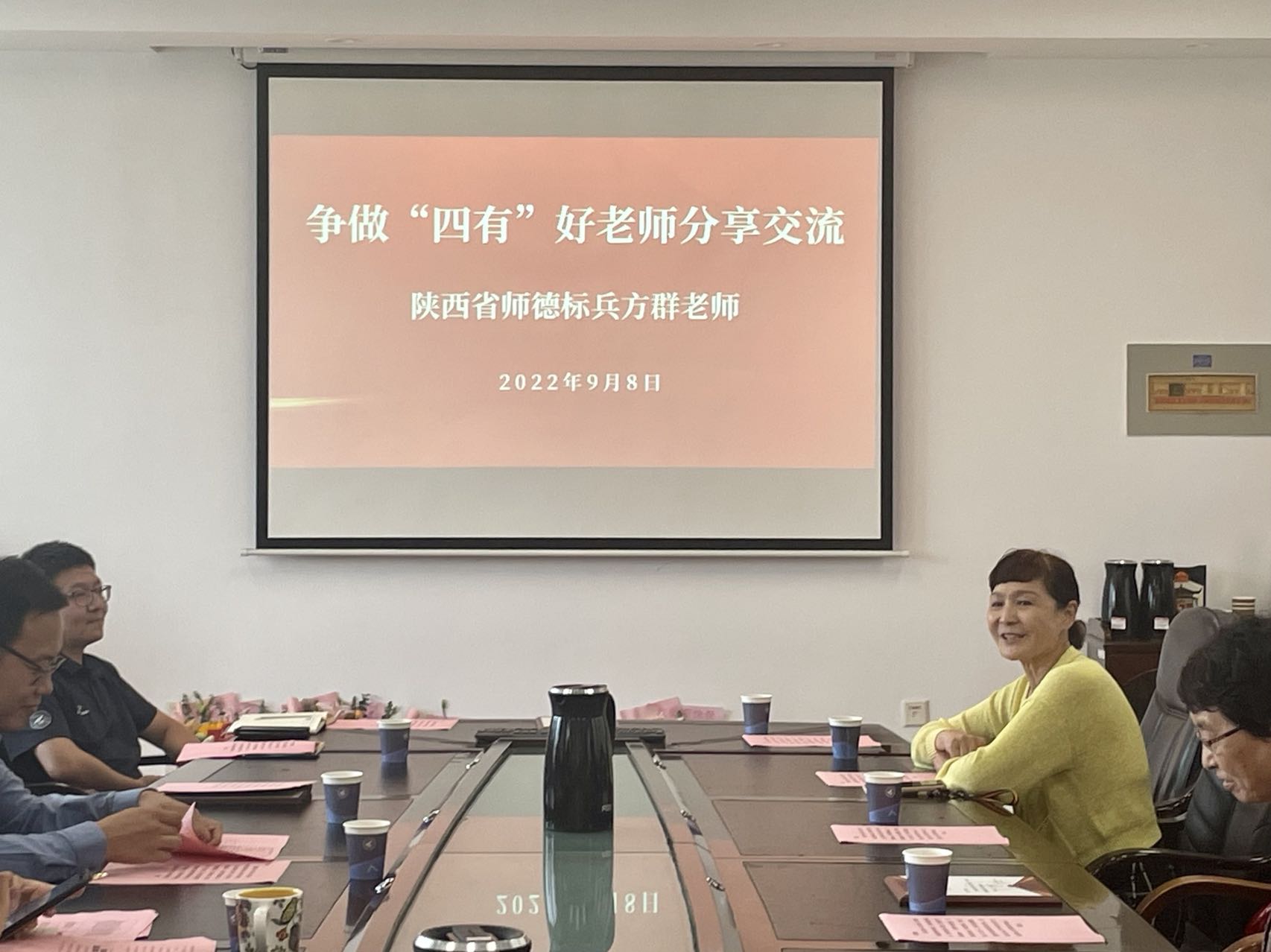 表彰后,陕西省师德标兵方群老师作师德师风专题报告。方群老师结合自身经历,从“讲好课”和“育好人”两方面分享了从教多年的心得体会。她谈到,作为教师要正确认识教书育人的岗位职责,应敬畏课堂,注重细节,认真负责地讲好每一堂课。同时,要积极探索思政元素与课堂教学有机结合的工作路径,为国家培养出有爱国情、报国志的卓越人才。