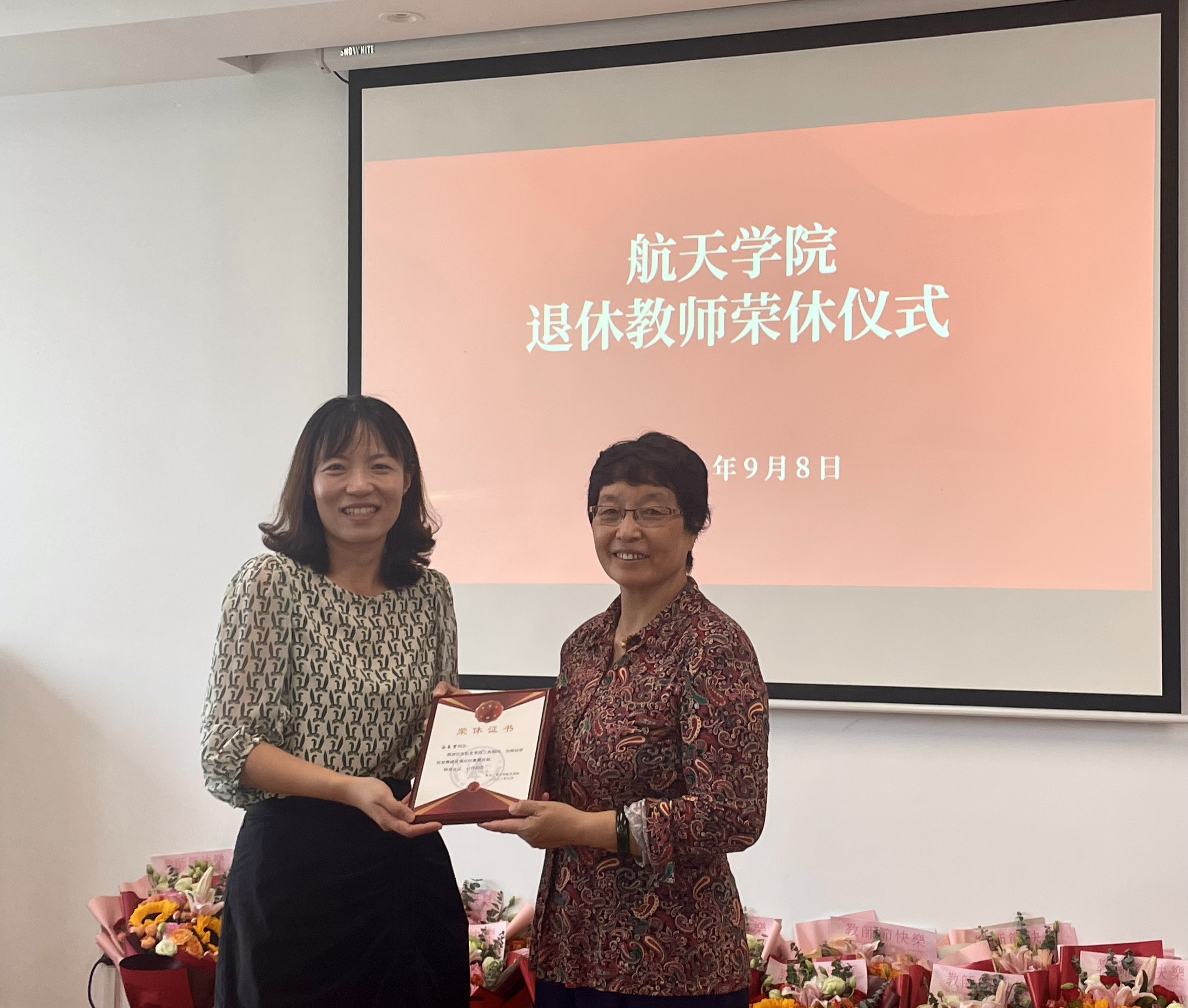 首先,黄越为退休教师代表谷良贤教授颁发荣休证书,并由青年教师代表献上花束。黄越表示,老教师是学院的“宝贵财富”,希望老教师们持续关注和支持学院发展,关心青年教师成长,传承航天精神文化。