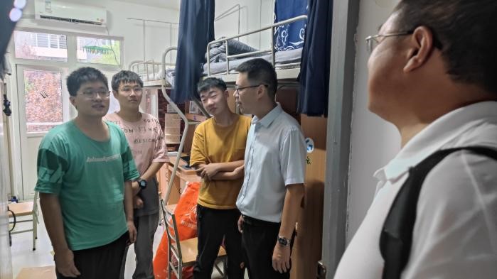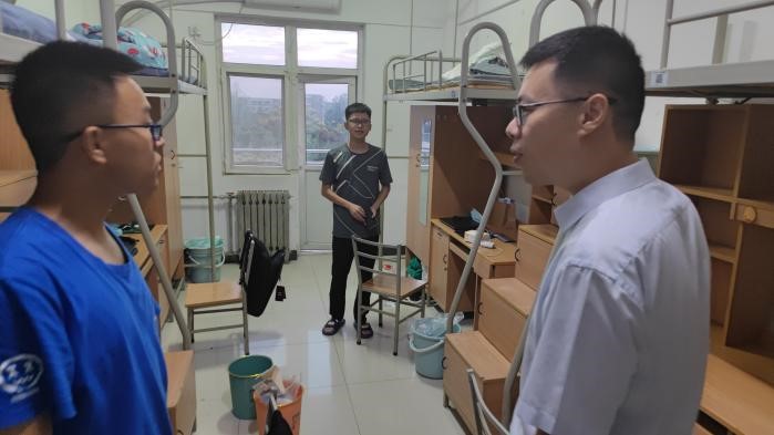 党委副书记韩冬、2022级本科生辅导员周国财前往宿舍看望新生,与同学们亲切交谈。韩书记和周老师叮嘱同学们在疫情当下要保护好自己,认真遵守学校静态管理政策,希望大家多在校园内走一走,尽快熟悉校园,并预祝同学们中秋节快乐。