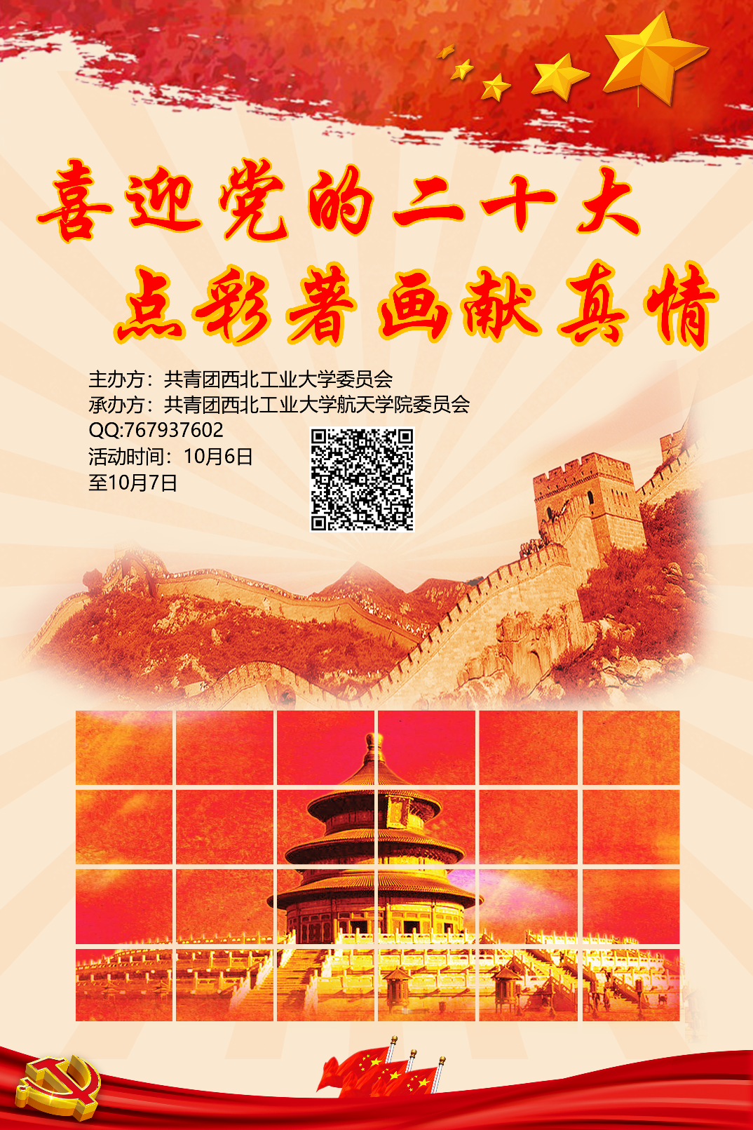 以三人团队的形式报名参赛,提前构思图形样式,并于比赛当日,在规定时间内,通过粘贴小色块组成契合国庆和喜迎党的二十大的主题的像素风格图画作品。工作人员收集作品后经打分评选出优秀作品并进行展览。