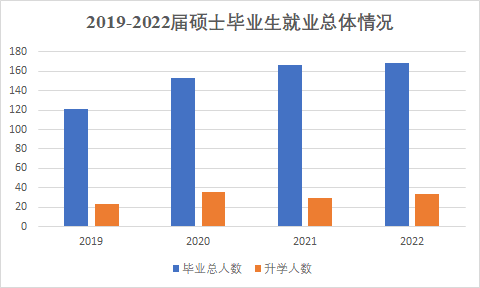 2019-2022届硕士生毕业人数分别为:121、153、167、169人,就业率分别为100%,98.04%,98.17%,98.22%,每年选择升学(包括国内升学和出国出境)的人数分别为23、36、29、34人,基本维持在20%左右的水平。