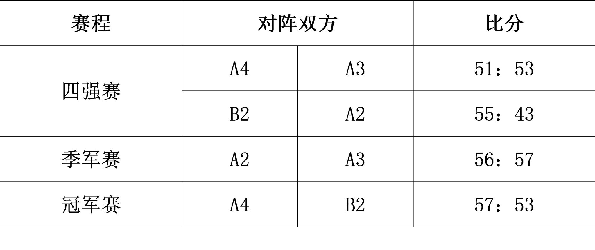 “金秋杯”研究生迎新篮球赛进入决赛阶段。经激烈角逐,A4队获得本次比赛的冠军,B2队、A3队、A2队分别获得亚军、季军和殿军。