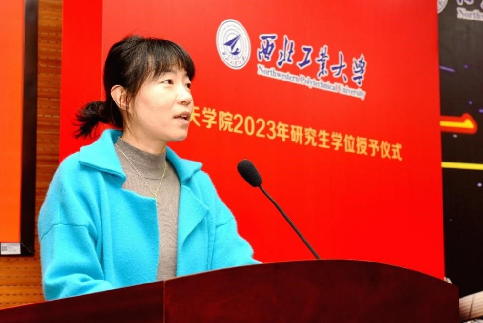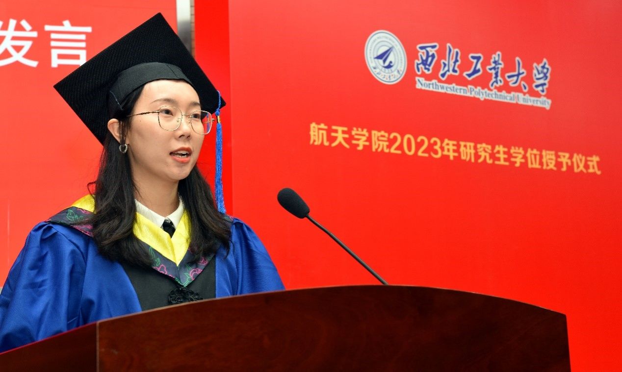 毕业生代表王红梅同学发言,言语中表达了对母校的不舍和对老师的感激。她表示立志将“公诚勇毅”的校训和“三实一新”的校风内化于心,外化于行,继续传承和发扬工大精神、航天精神,乘风好去,长空万里,在逐梦太空的征途上发出青春的夺目光彩!