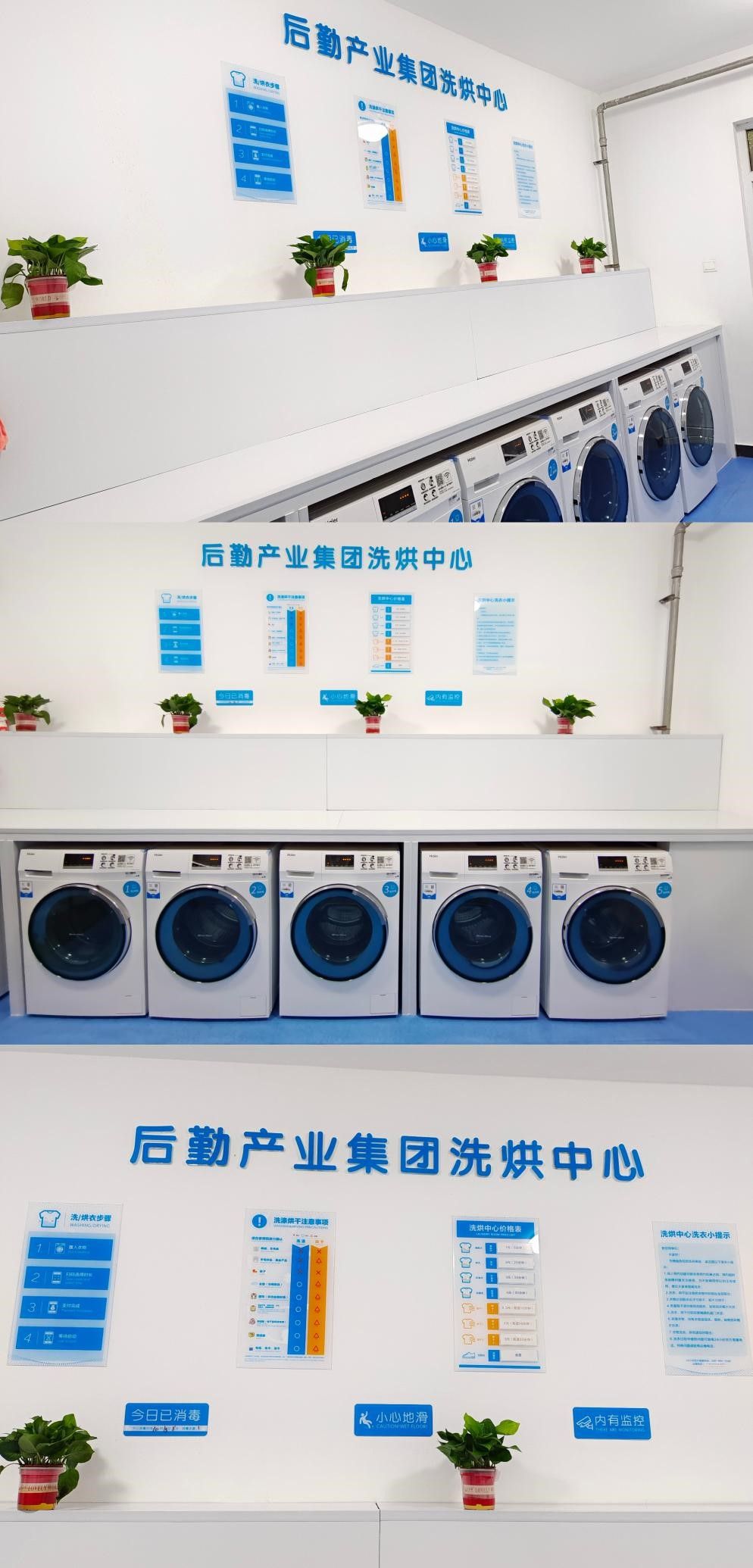 每栋宿舍楼的一楼都设有一间洗衣房,并且配备多台全自动洗衣机,使用时只需打开支付宝扫描洗衣机上二维码并选择清洗模式即可。航小天提醒您,周末一般是洗衣高峰时段,可以合理安排时间错峰洗衣,避免不必要的时间浪费。