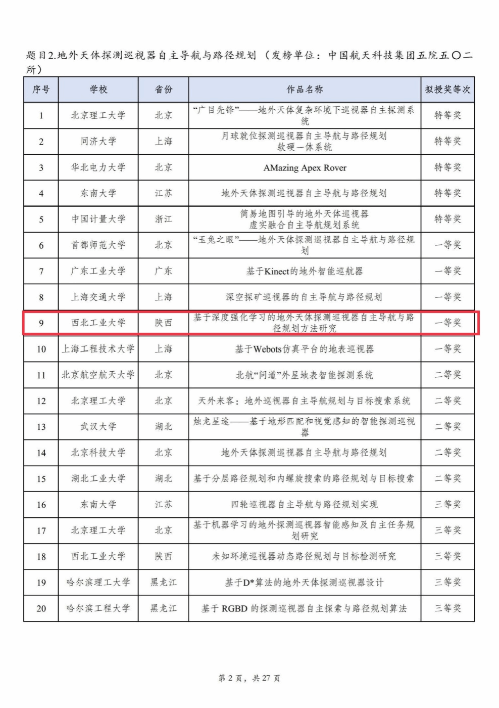 呼卫军教授及其研究生团队的参赛作品“基于深度强化学习的地外天体探测巡视器自主导航与路径规划方法研究”获专项赛一等奖。