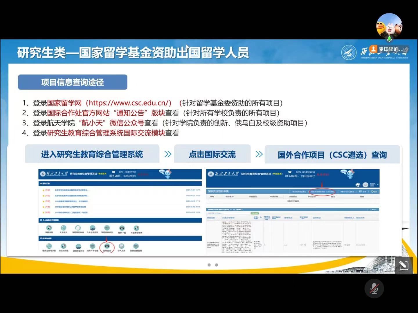 宣讲会分为三个部分:分别为研究生出国(境)交流项目、本科生出国(境)交流项目、项目的申报流程及资助政策。在研究生及本科生项目的介绍过程中,根据资助来源的划分,又分为国家留学基金委资助,学校、学院及导师资助项目两种形式。淡宁宁在国家留学基金委资助项目里分别介绍了国家建设高水平大学公派项目、创新型人才合作培养项目、与俄乌白国际合作培养项目;而在学校资助项目部分里,介绍了领军人才项目、西北工业大学-香港理工大学的博士双学位联合培养项目、高水平国际会议及其他类型的校级学位和学分项目等。项目介绍完成后,淡宁宁随后对各类项目的申请流程相关情况及资助情况进行了说明,最后列举了申报项目的注意事项以及各种项目信息的查询网站等。