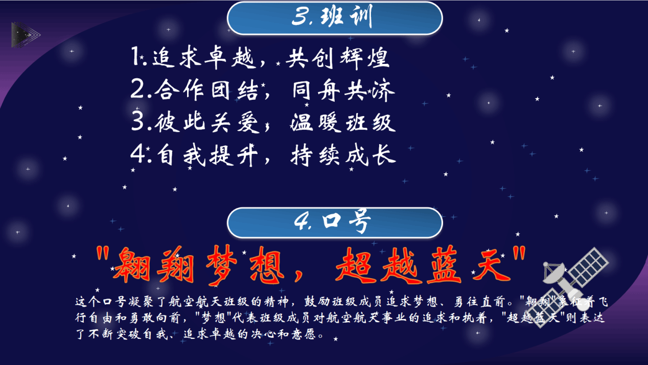 15班“以浩瀚的星空作为背景,既展现出航天事业的舞台,也代表着我们探索未知,飞天报国的目标”: