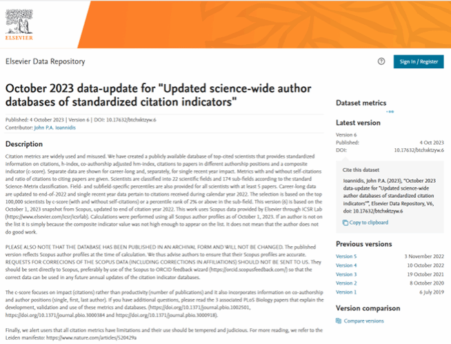 资料来源:Ioannidis, John P.A. (2023), “October 2023 data-update for "Updated science-wide author databases of standardized citation indicators"”, Elsevier Data Repository, V6, doi: 10.17632/btchxktzyw.6