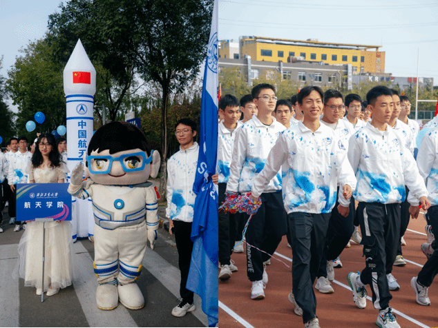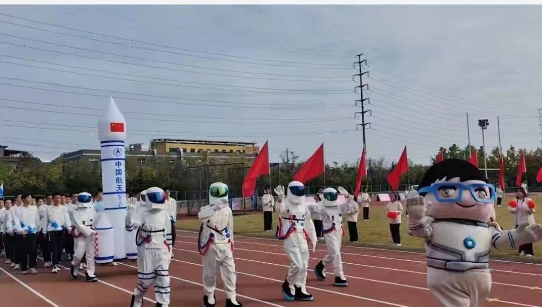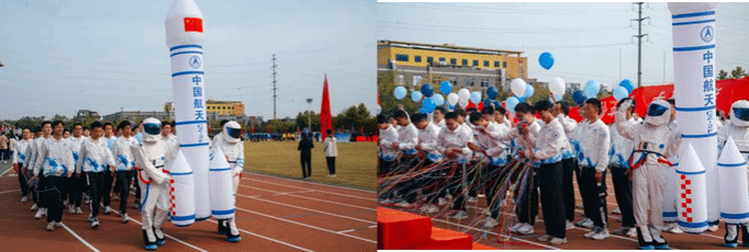 的学子们身着统一服装,迈着整齐的步伐,喊着响亮的口号走过主席台,展现出良好的精神风貌。方阵同学们手执蓝白气球和彩带,象征着航天学子对星辰大海的无限向往。航小天悄然亮相,前排身着宇航服的队员和大火箭更是彰显了航天特色,让全场观众耳目一新。