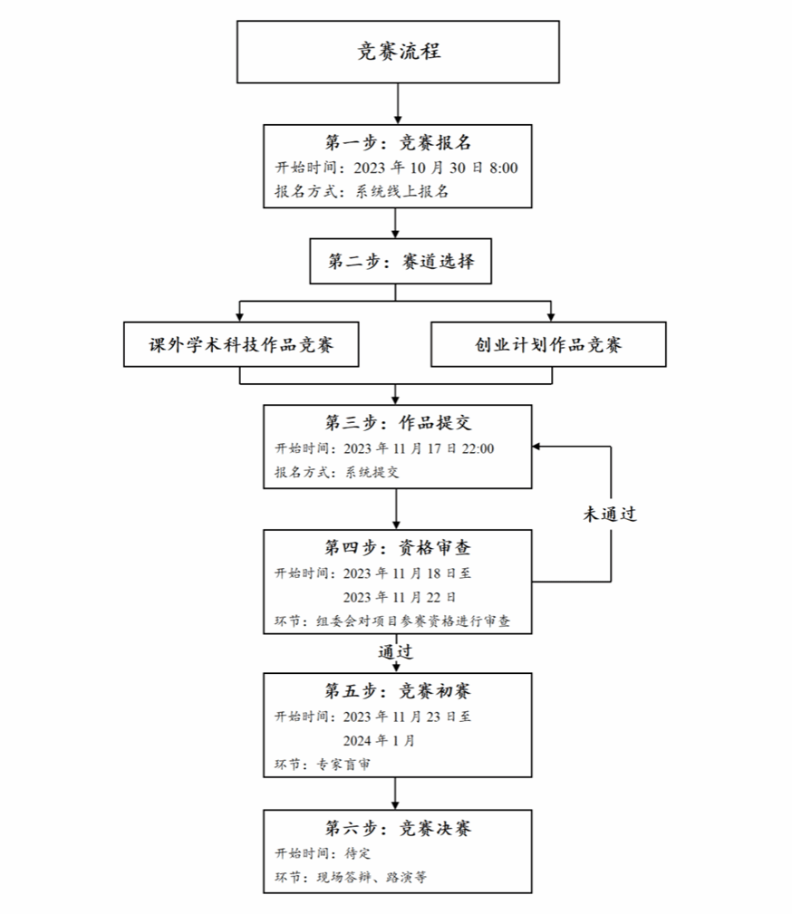 竞赛包括两个主体赛道:创业计划作品竞赛和课外学术科技作品竞赛。各赛道相互独立,参赛作品仅可选择一个赛道进行参赛;参赛作品应积极践行社会主义核心价值观,突出原创性、真实性,不得侵犯他人知识产权,不得借用他人作品参赛。存在剽窃、盗用、提供虚假材料或违反相关法律法规的,一经发现将取消参赛资格。