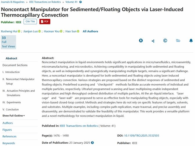 罗建军教授团队博士生惠旭晟在液体环境非接触式操控技术研究方面取得了突破性进展。相关研究成果以“Noncontact Manipulator for Sedimented/Floating Objects via Laserinduced Thermocapillary Convection”等为题形成了系列论文,发表在机器人领域顶级期刊《IEEE Transactions on Robotics》 (T-RO)、机器人顶会《IEEE International Conference on Robotics and Automation》 (ICRA 2025接收),以及机电领域顶刊《IEEE/ASME Transactions on Mechatronics》 (TMECH)上,西北工业大学为上述系列论文的唯一作者单位,博士生惠旭晟为上述系列论文的第一作者,台湾三级